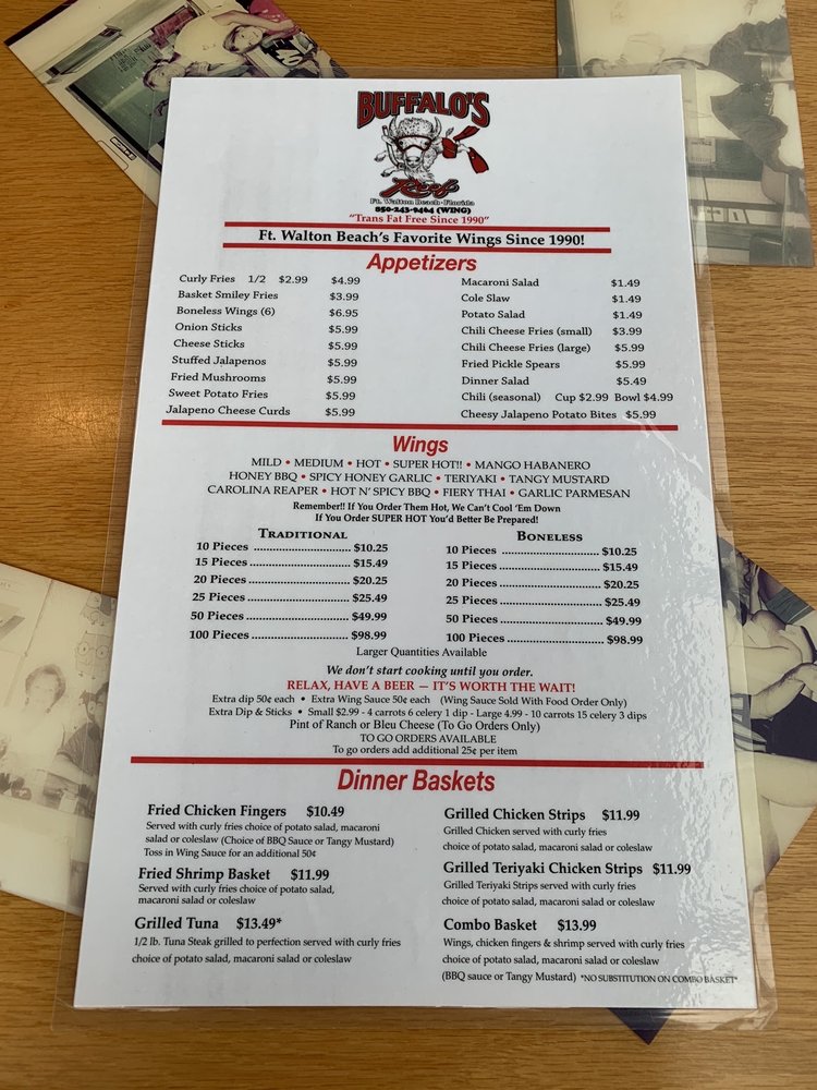 Buffalo's Reef in Fort Walton Beach, FL, offers a diverse menu of burgers, chicken wings, and sandwiches. The restaurant provides various utilities such as takeout, delivery, reservations, and catering options, making it a convenient choice for a meal. With many vegetarian options available, the menu caters to a wide range of dietary preferences. The sandwiches at Buffalo's Reef include favorites like the BLT, Chicken Finger Sandwich, and Grilled Tuna Sandwich. The Buffalo Chicken Wings are cooked to order and come in a variety of flavors to satisfy every taste preference. The fresh salads, including the Chef Salad and Grilled Chicken Salad, are perfect for those looking for a lighter option. Overall, Buffalo's Reef is a casual spot with good food and a welcoming atmosphere for a satisfying meal.